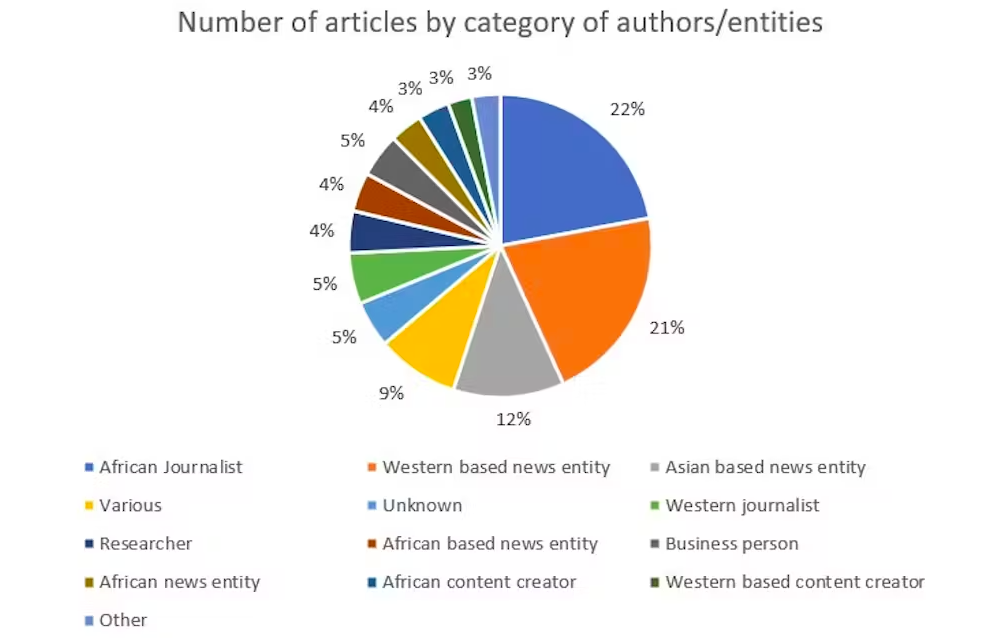 African journalists, news entities and content creators contributed some 29% of the articles. But western-based news entities (21%) and journalists (5%) had a considerable influence. Global news agencies like AFP (15%) and Reuters (6%), along with tech news providers like Research Snipers (13%), frequently wrote these pieces.