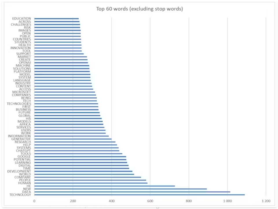 We also analysed the words used most frequently. The frequent mention of Google, Microsoft and ChatGPT reflects the dominance of western tech giants in the AI landscape. Words like “he” and “his” appeared disturbingly frequently, while feminine pronouns weren’t among the top words. This indicates a bias towards male perspectives.