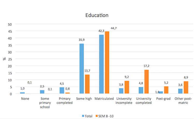 Education is useful in climbing the social and corporate ladder, and SEM 8-10 consumers are particularly privileged in that regard: 85.2% have matric or higher level of education compared with 56.1% of the population as a whole; 69.2% of adults who have completed university fall into this group, as do 63.4% of those with post-graduate qualifications.