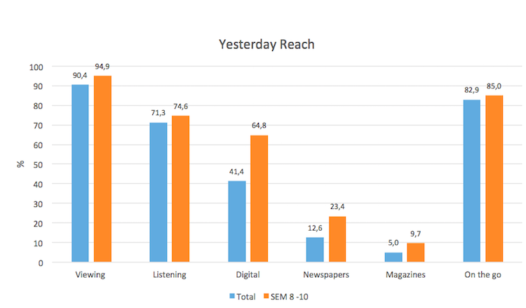 In broad terms, SEM 8-10 the heaviest consumers of media. Outdoor and broadcast media offer the highest penetration of this group, with digital media performing well. They are also much more likely to be readers.