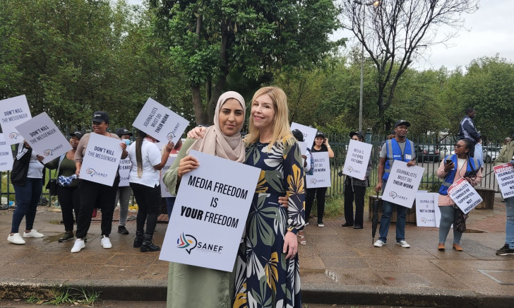 Former News24 journalist Qaanitah Hunter with Karyn Maughan, fronting a picket outside court