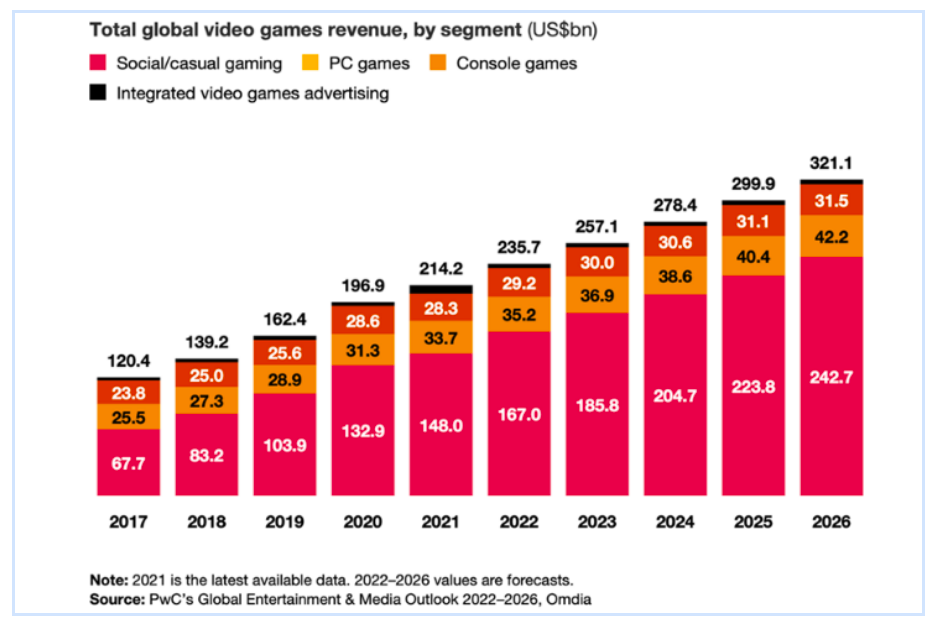 The expansion is expected to make the global gaming industry worth $321 billion by 2026, according to PwC’s Global Entertainment and Media Outlook 2022-26.