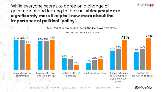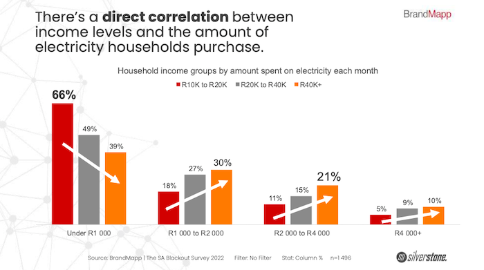 BrandMapp’s director of storytelling, Brandon de Kock, says, “We focus on the estimated 13 million individuals who comprise 100% of the personal taxpayer base. They are the lucky ones, the most resilient segment of society, who are best positioned to be able to buy themselves out of blackouts. If we can get a measure of how they are handling things, it might allow us to plan better, or differently for the future, and at very least give us insight into some of the hidden costs of our energy crisis. And at the same time, it will give us an idea of just how hard life in the dark must be for the millions of lower-income citizens who have far fewer options.”