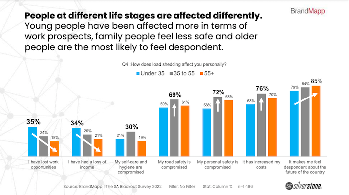 82% of mid to top income South Africans say that load shedding makes them despondent about the future of our country. It is the most impactful personal effect of load shedding with ‘increased costs’ in second place with just 70%. “Let that sink in,” says De Kock. “Our legendary sense of hopefulness as a nation, that has seen us through so much in the past 30 years, might just be the biggest casualty of this whole mess.”
