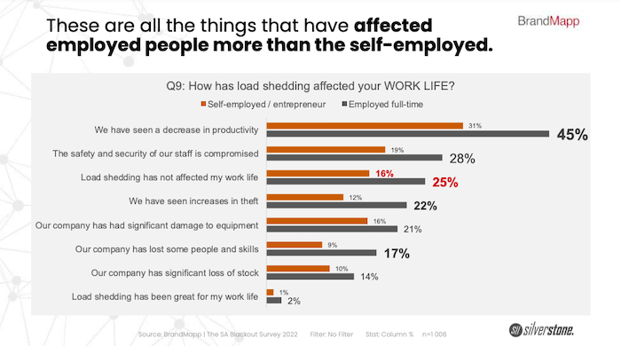 22% of business owners have experienced a significant loss of business revenue, and 33% say that they have lost some billings due to blackouts. De Kock says, “We’re talking here of a total 44% of self-employed entrepreneurs losing money when the power goes down. 75% also say their personal costs have increased. These are the risk-takers, the sole businesspeople and founders of start-ups who are vital to our economic health and play an outsized role when it comes to generating much-needed employment. They also face barriers to accessing finance to get them through tough times. In the fullness of time, we will have a better view of load shedding impacts on the multitude of small-businesses which we rely on to drive innovation and create employment, but given that they were only just starting to recover from the craziness of Covid, one can’t help feeling a bit bleak about the short-term health of the sector.”