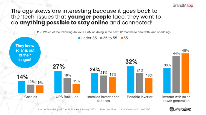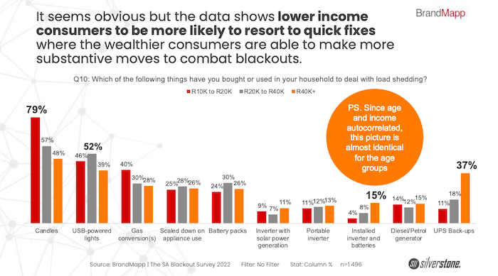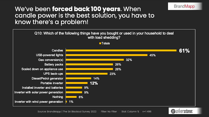 61% of mid- to top-income South Africans resort to candle power during load shedding hours. De Kock says, “We’ve been forced back 100 years! When candle power is the best solution, you have to know there’s a problem. Only 32% have pivoted to gas. Battery packs and UPS back-ups help some get through the load shedding hours. However, the deployment of full solutions such as inverters and generators is low, and no doubt that is linked to high costs that are simply out of reach for most middle-income South Africans.”