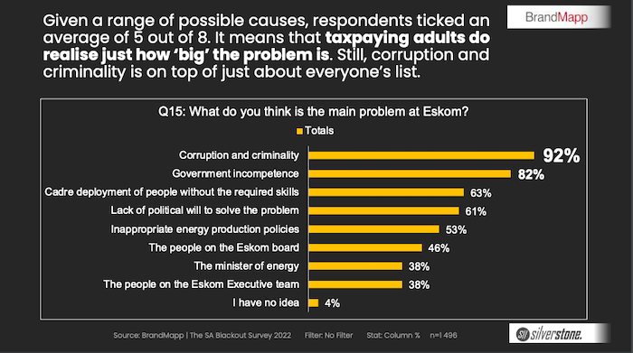 Presented with a range of possible causes, the SA Blackout Report respondents ticked an average of 5 out of 8. De Kock says, “This indicates that the taxpaying adults do realise just how big and complex the power problem is. Not surprisingly, corruption and criminality is on top of just about everyone’s list, with 92% recognising that their country is being fleeced by criminals.”