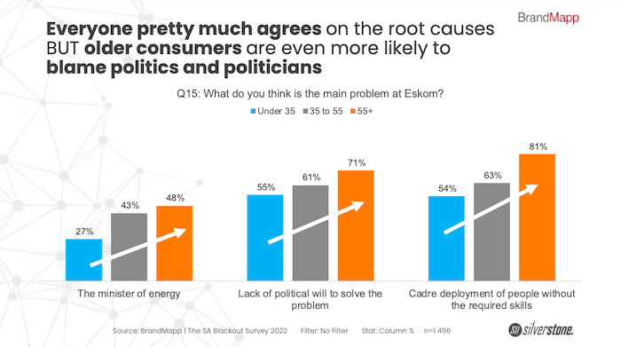 De Kock says, “BrandMapp typically favours taking a glass half-full point of view, but to be honest, that’s extremely hard right now. When the most positive thing you can say is that there is clearly a heightened sense of urgency and anxiety in the populace, well that still sounds half-empty, doesn’t it! We’ve got face that 50% of mid- to top-income consumers don’t believe that load shedding will ever come to an end. That level of despondency is reflected also in other survey data that shows that 58% of young adults say they are considering emigrating because of load shedding.”