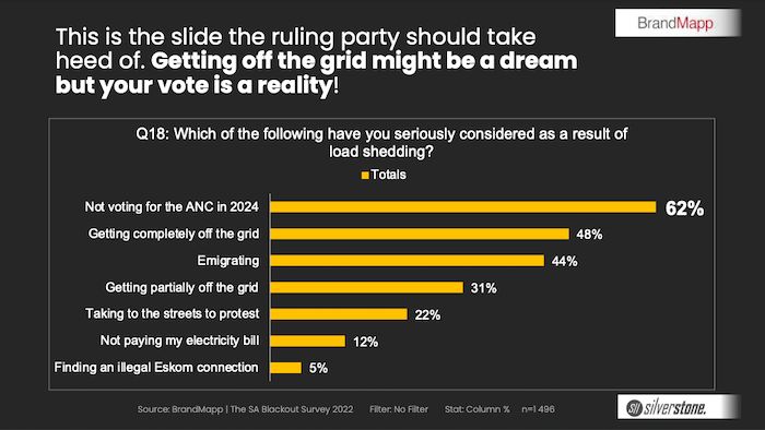 70% of respondents believe that investments in sustainable energy solutions and policy change are the top two ways to cure the country’s load shedding ills. De Kock says, “While there’s high awareness that getting off the grid is a sustainable solution, the reality is that it’s not affordable for most South Africans. However, they can use their vote, and 62% think that not voting for the ANC in 2024 is a necessary response to load shedding.”