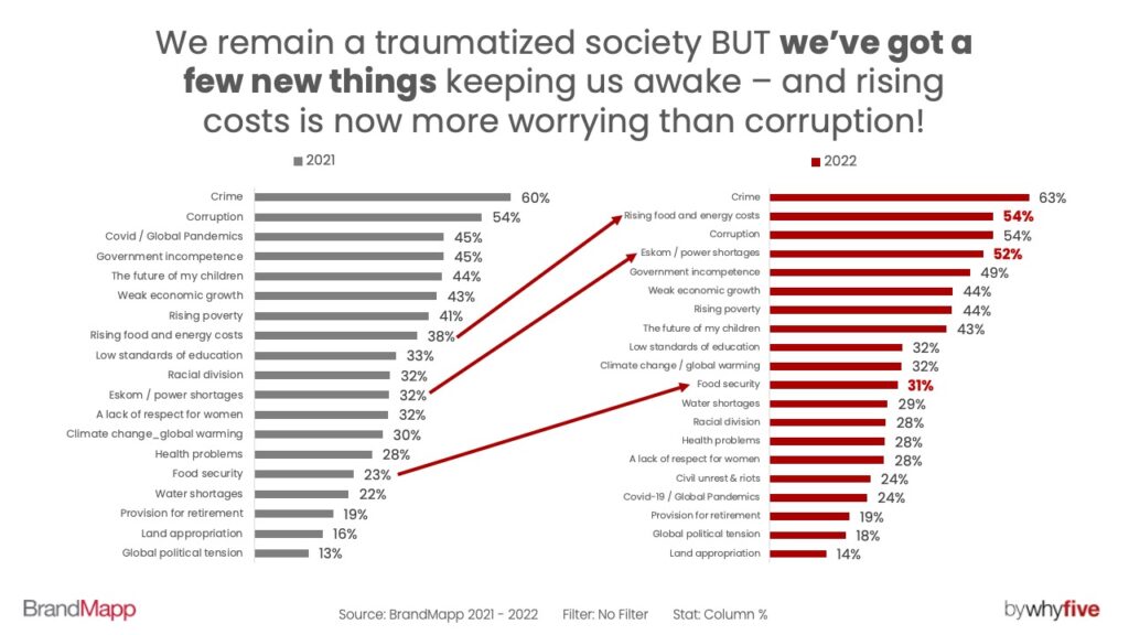 While the perception of being under serious threat due to crime persists, in 2022 there were several shifts in what causes us to count sheep instead of sleeping well. Rising costs of food and fuel leapt up the rankings, overtaking our anxieties about corruption and there’s also been a 20% spike in people worrying about Eskom’s power shortages. Despite having more resources to cushion the blow of the soaring inflation the country has experienced in 2022, mid-to top-income South Africans are worried about the basics of life.