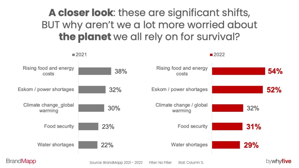 De Kock says, “It’s interesting to note that despite dramatic climate events across the globe, and severe climate stresses in the country, from droughts to floods, only 32% of mid- to top-income South Africans say that they are concerned about climate change, the greatest existential threat of our times. What we have seen in 2022, is an increased worry about water shortages particularly amongst people living in KwaZulu-Natal and the Eastern Cape, who have had real-life experiences due to flooding and drought, respectively. Even though these local events have been clearly linked to climate change, this hasn’t translated into a similar increase in concern for the global context.”