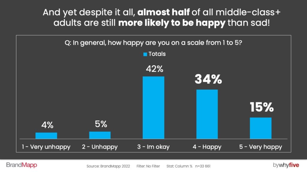 South Africa is nothing if not a resilient nation, and BrandMapp 2022 reveals a sunny outlook despite the intensification of our worries. 42% of the middle class say that they’re okay, and 49% say that they are happy or very happy. Only 9% acknowledge that they are unhappy or very unhappy.