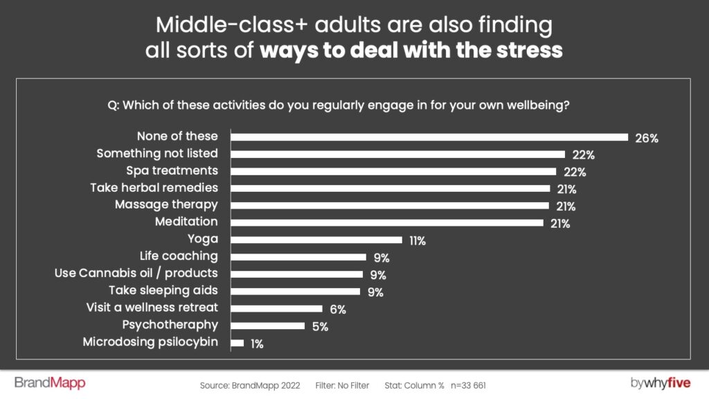 He may not be entirely joking. BrandMapp 2022 also confirms that 75% of mid-to-top income South Africans consume alcohol, a tried and tested way to forget your worries in the short-term, but a less successful strategy when it comes to sustainable well-being and improved mental health outcomes.